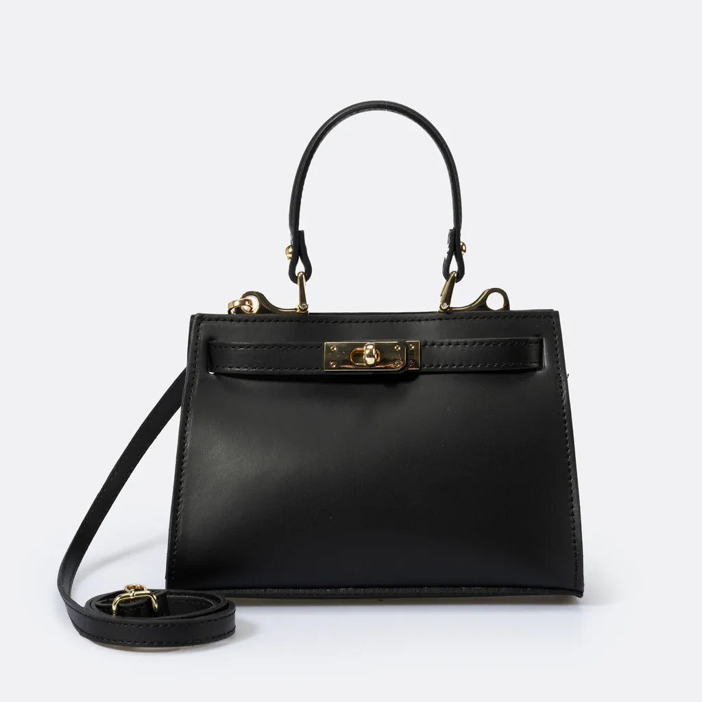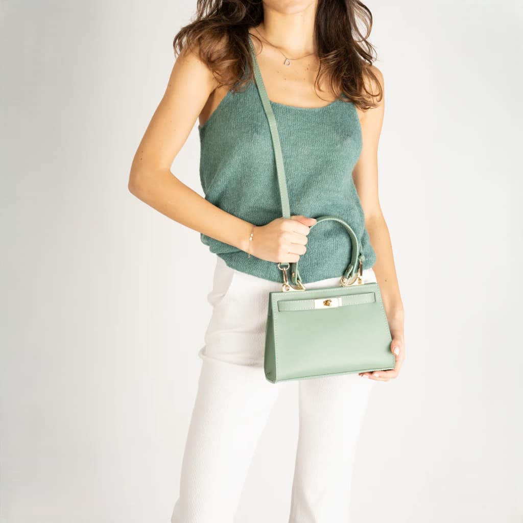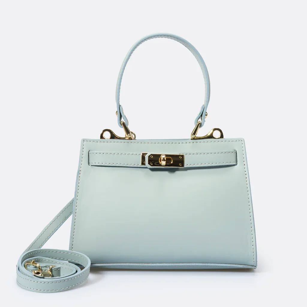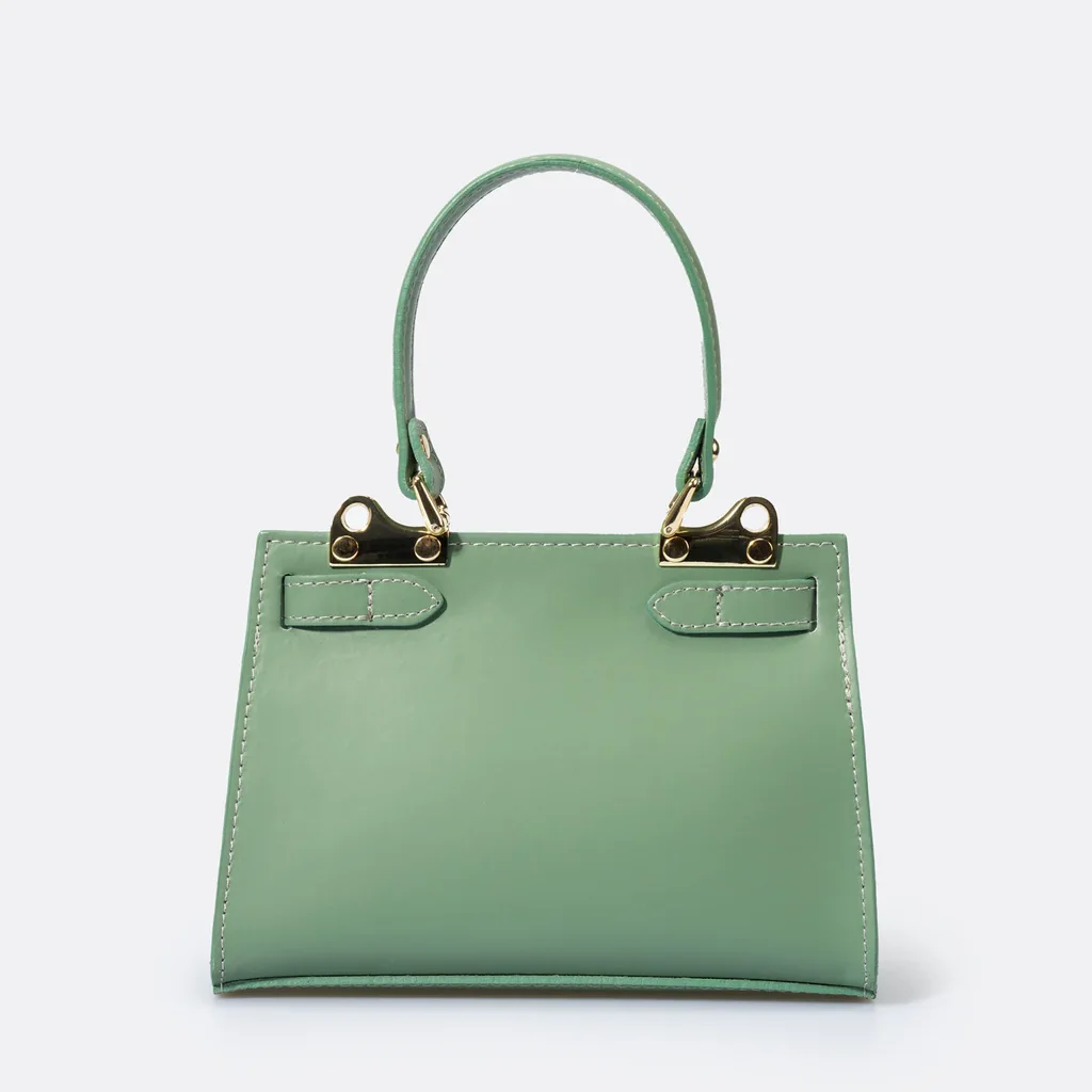 Petite, polished, and irresistibly poised — Verelina brings quiet confidence to every occasion. Crafted in Italy from smooth, structured leather, this compact top handle bag shines in a soft mint tone, accented with gold hardware and a refined twist-lock closure.
